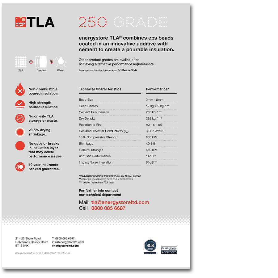 energystore TLA® combines eps beads coated in a specially formulated additive with cement and water to create a pourable insulation. This poured insulation offers an A2 - s1, d0 fire rated alternative for use in floor and roof construction as a high strength void former or insulation.